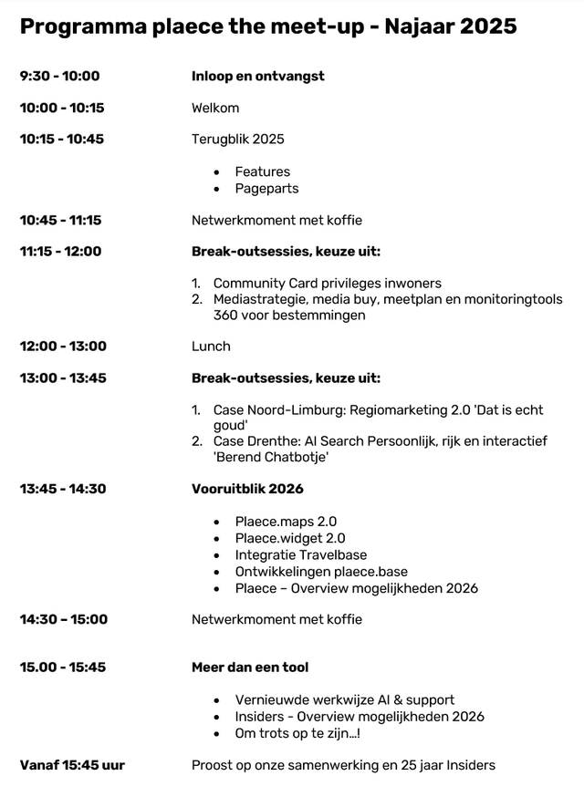 Op 9 oktober staat plaece de meet-up op de agenda. Tijdens dit event nemen we je mee in wat er het afgelopen jaar allemaal is gelanceerd aan nieuwe pageparts en features. Daarnaast geven we je alvast een kijkje achter de schermen in wat er nú in ontwikkeling is. Ook staan er vier interactieve sessies gepland, waarin we samen met jullie in gesprek gaan over actuele thema’s en uitdagingen. Je kunt je aanmelden voor twee van deze sessies.